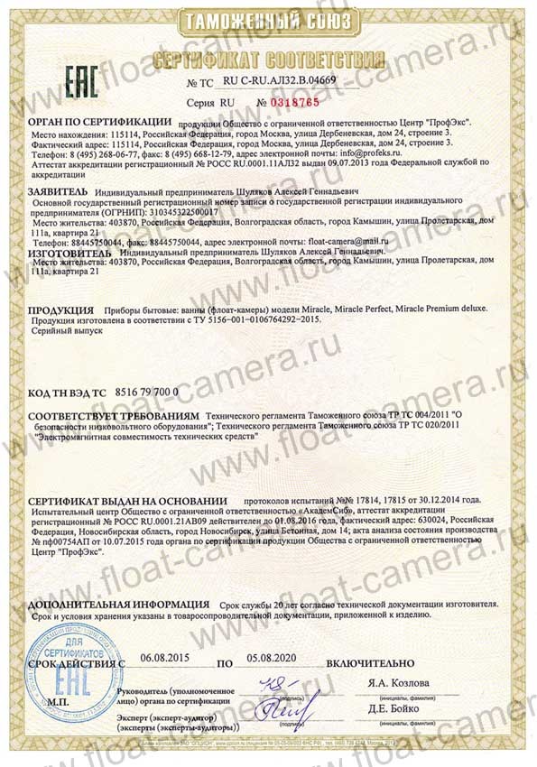 Флоат-камера была приобретена в 2019 году. Срок службы 20 лет.